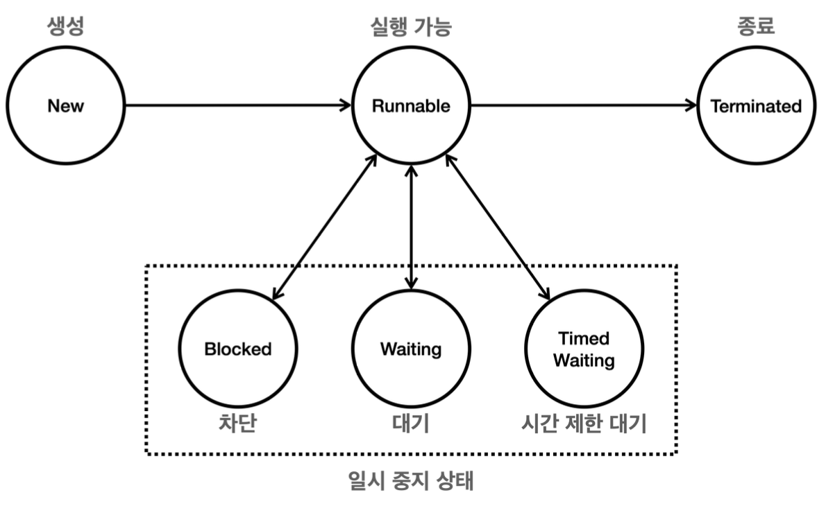 | RUNNABLE | 스레드가 실행 중이거나 실행될 준비가 된 상태 | • RUNNABLE → BLOCKED: 스레드가 lock을 얻지 못한 경우 • RUNNABLE → WAITING: wait() , join() 호출• RUNNABLE → TIMED_WAITING: sleep(long millis) , wait(long timeout) , join(long millis) 호출• RUNNABLE → TERMINATED: 스레드 실행 완료 |