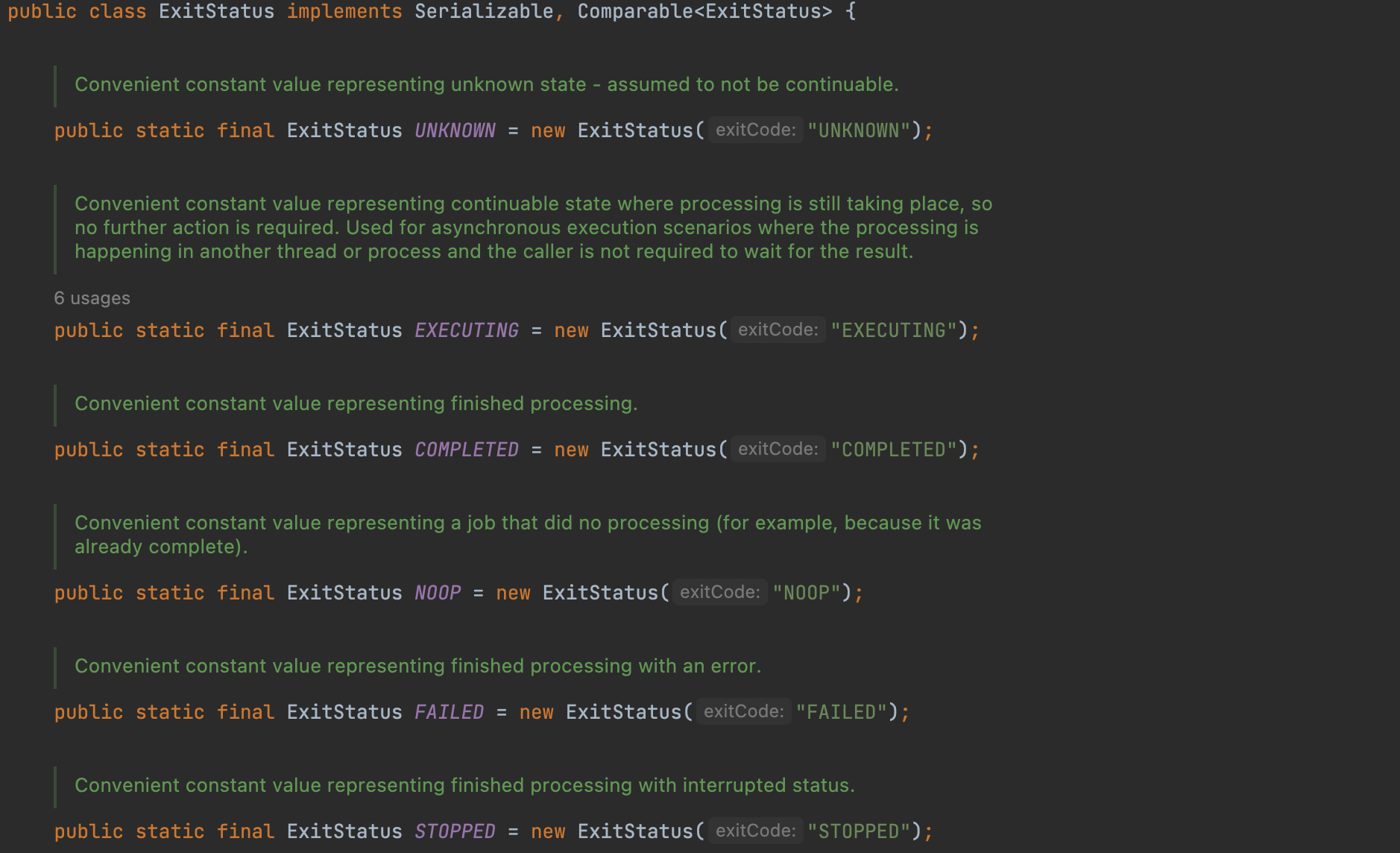 반면 흐름 제어에서 참조하는 ExitStatus는 Step의 실행 후 상태를 얘기합니다. ExitStatus는 Enum class가 아닙니다.
