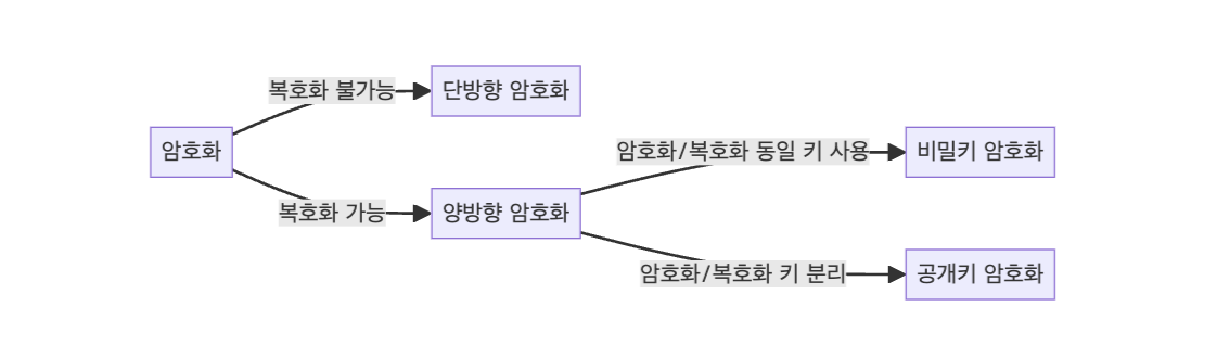 암호화 방식은 복호화 가능 여부에 따라 단방향/양방향 암호화로 나누고, 양방향 암호화 내에서 암호화/복호화를 위해 사용되는 키에 따라 비밀키(대칭키) 암호화와 공개키(비대칭키) 암호화로 분류할 수 있다.