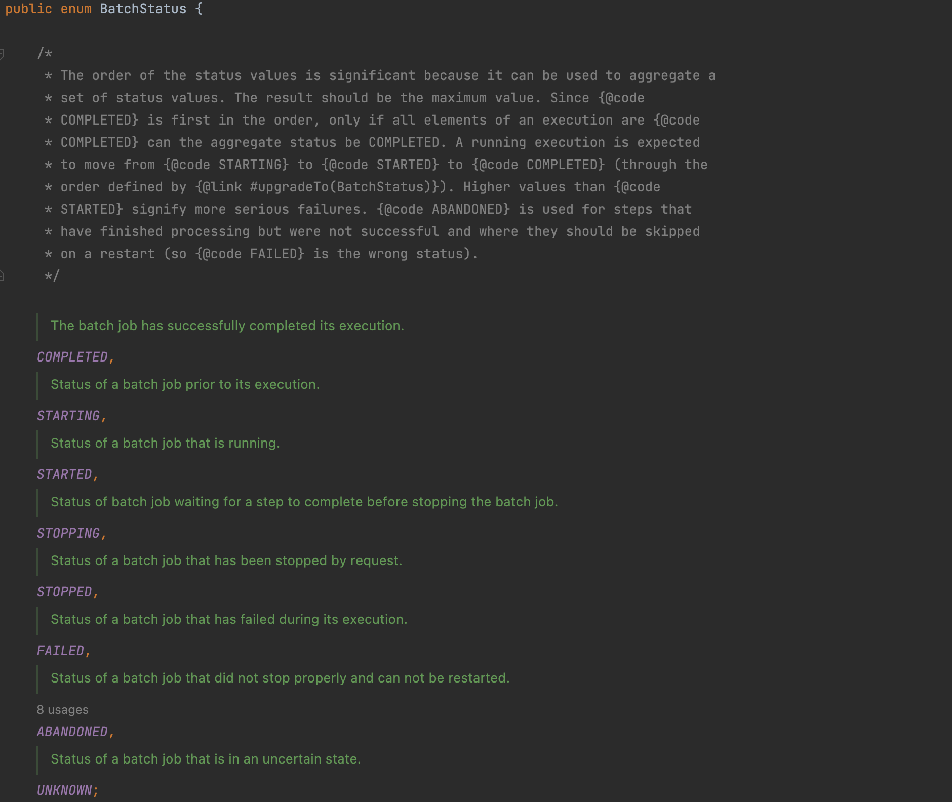 배치 애플리케이션의 경우 데이터가 너무 많아서 처리 중 실패가 나는 경우 실패한 지점부터 작업을 처리하거나, 같은 파라미티로 같은 함수를 실행할 경우 실행 여부에 따라 작업을 제어해야할 수도 있습니다.