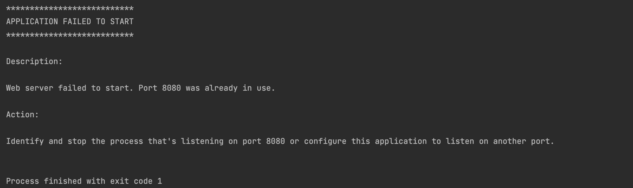 Description: Web server failed to start. Port 8080 was already in use. Action: Identify and stop the process that's listening on port 8080 or configure this application to listen on another port.